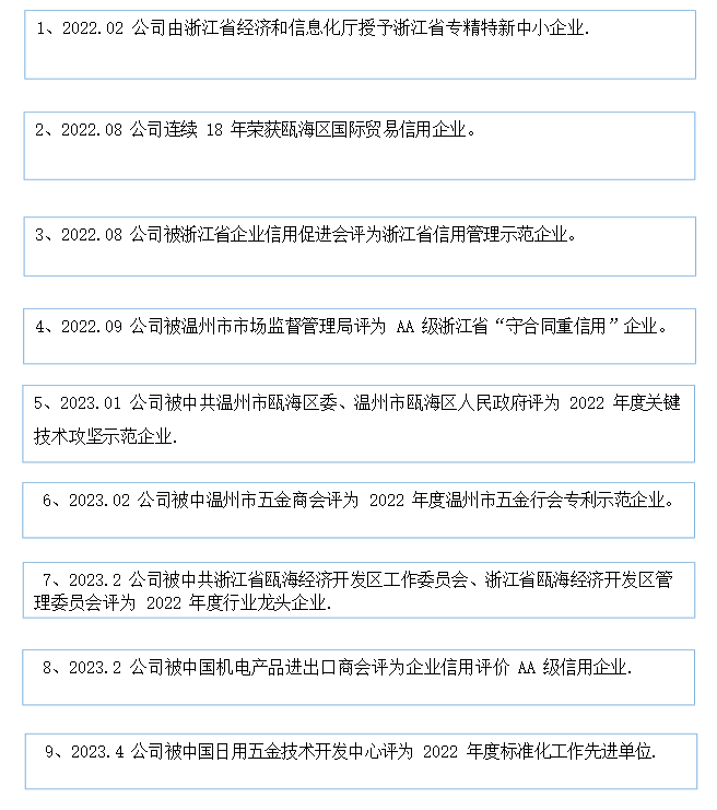 公司于 2002 年被認定中國日用技術研究開發(fā)中心為“中國自行車鎖具中心”,2003 年浙江省經(jīng)信委認定公司技術中心為“省級企業(yè)技術中心”,2004年浙江省科技廳認定公司研發(fā)中心為“省級高新技術研究開發(fā)中心(新型鎖具)”, 2016 年溫州市經(jīng)信委認定本公司設計中心為“市級工業(yè)設計中心”。2015 年設立有浙江省博士后工作站;并建有甌海區(qū)工匠大師工作室。2020 年再次通過國家高新技術企業(yè)復評。
